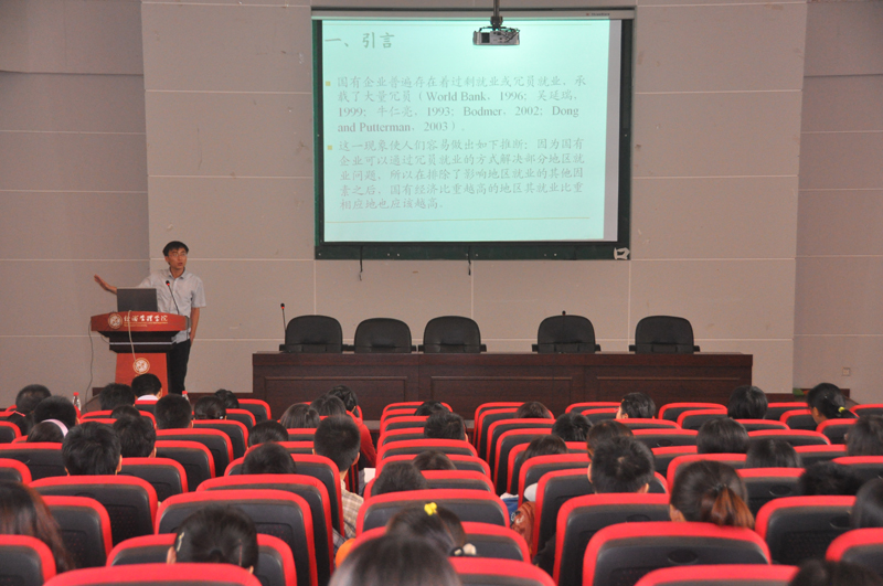 由学院经济学系主办的“现代经济学理论与方法创新论坛”第七卷第二期9月26日下午2点在太阳集团电子游戏金海报告厅举行。此次论坛的主讲人为复旦大学经济学院中国社会主义市场经济研究中心刘瑞明博士,学院经济学系范王榜副教授主持,学院的部分博士生,硕士生和基地班的本科生200多人参加了此次论坛。