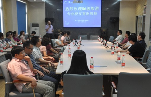 2010年8月7日上午9时,经管学院86级旅游专业校友在经管楼311报告厅隆重举行毕业20周年返校座谈等系列活动。来自国内外的近30名校友、经管学院旅游系退休教师朱玉槐教授、86级旅游专业班主任郝索教授、旅游系主任陈实副教授、院党委书记薛来前研究员、副院长李长宏副研究员、院办主任杨军良等师生参加了座谈会。返校座谈活动由86级旅游专业的班长陈永和团支部书记杨蓉同学主持。