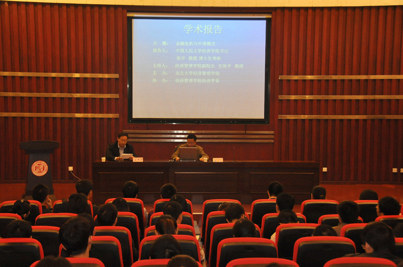 2009年10月26日晚7:00,中国人民大学经济学院党委书记、博士生导师张宇教授来太阳集团电子游戏作了一场“金融危机与中国模式”的学术报告,报告会由太阳集团电子游戏副院长任保平教授主持,学院部分教师、研究生及经济学系的本科生200多人参加。