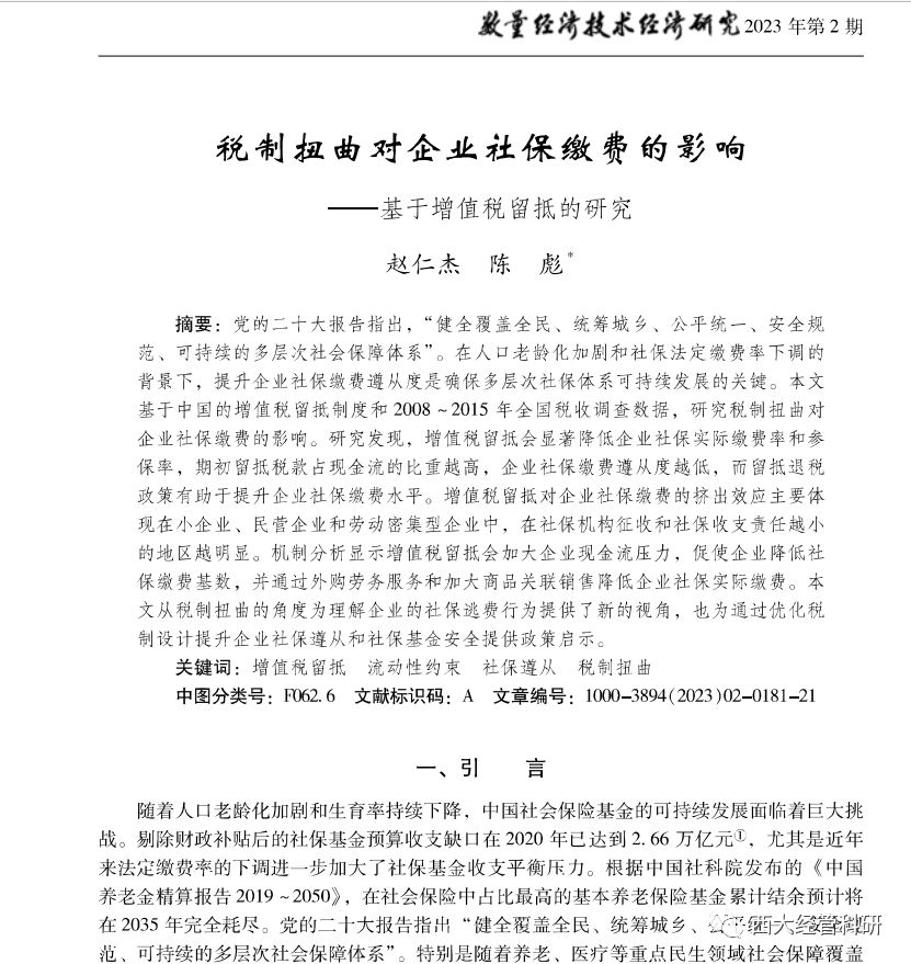 近日,太阳集团电子游戏经济学系副教授赵仁杰作为第一作者的论文在《税制扭曲对企业社保缴费的影响——基于增值税留抵的研究》在中国人文社会科学权威期刊《数量经济技术经济研究》2023年第2期发表,该文是赵仁杰副教授主持的国家自然科学基金青年项目、陕西省社会科学基金项目的阶段性成果。