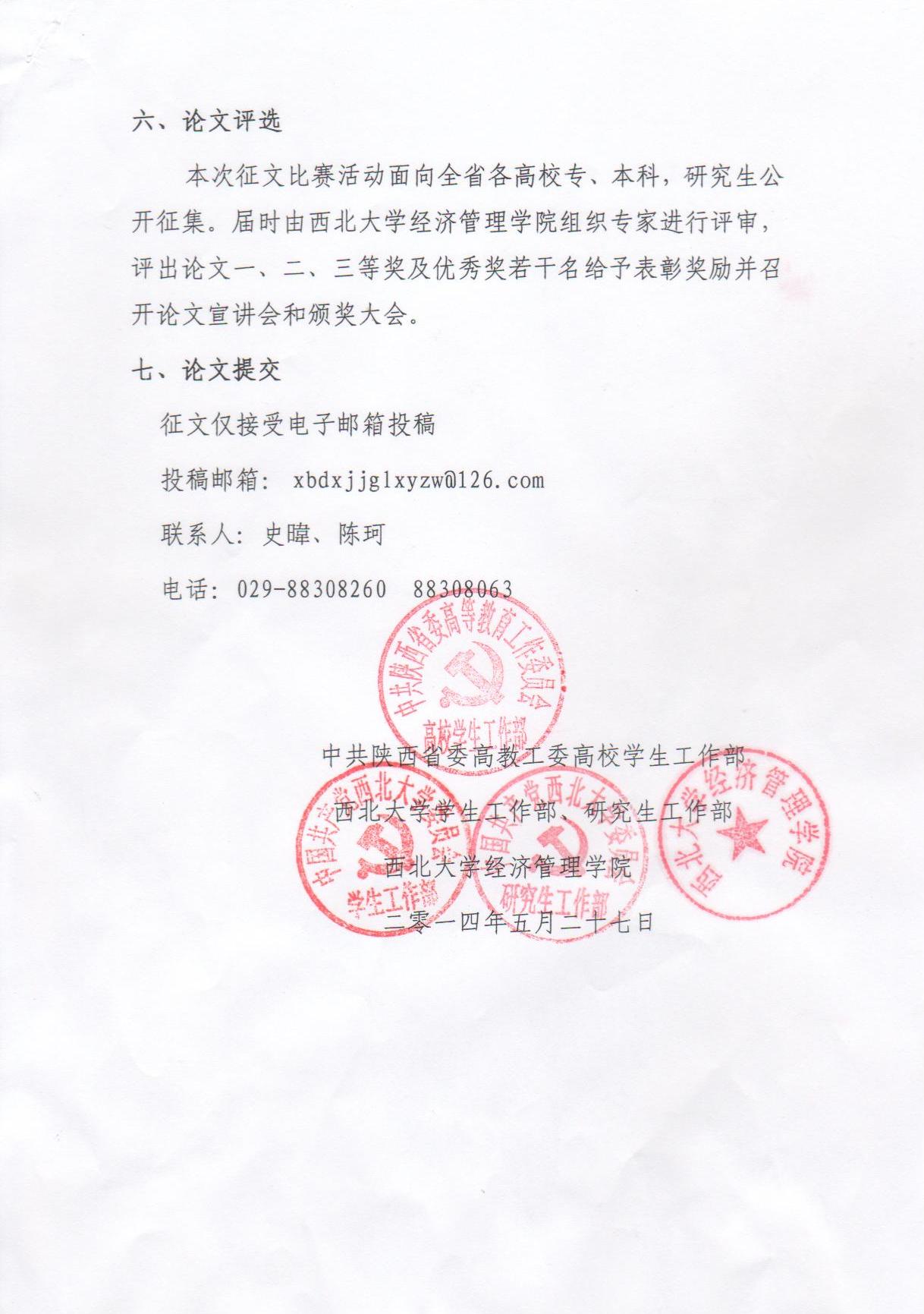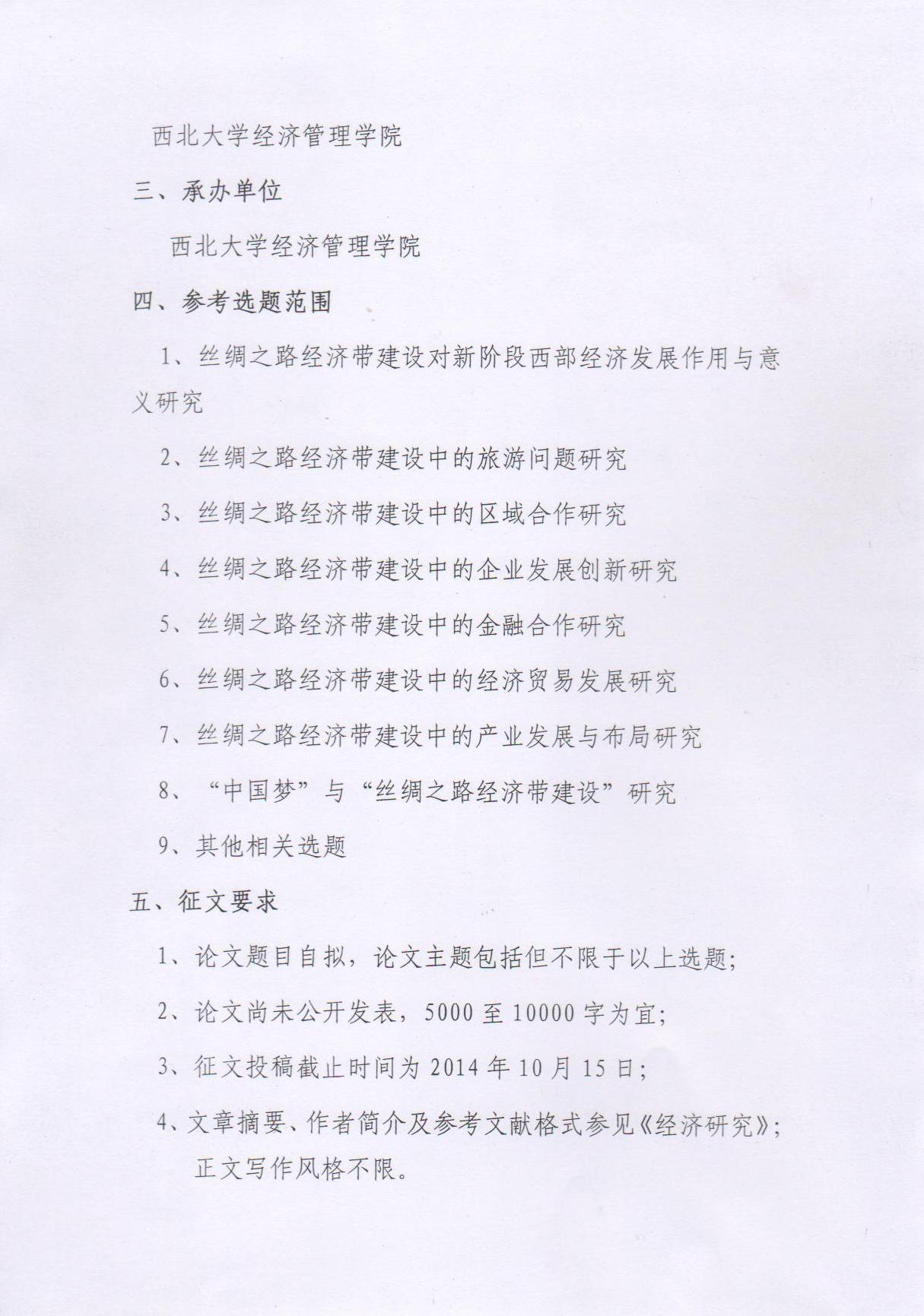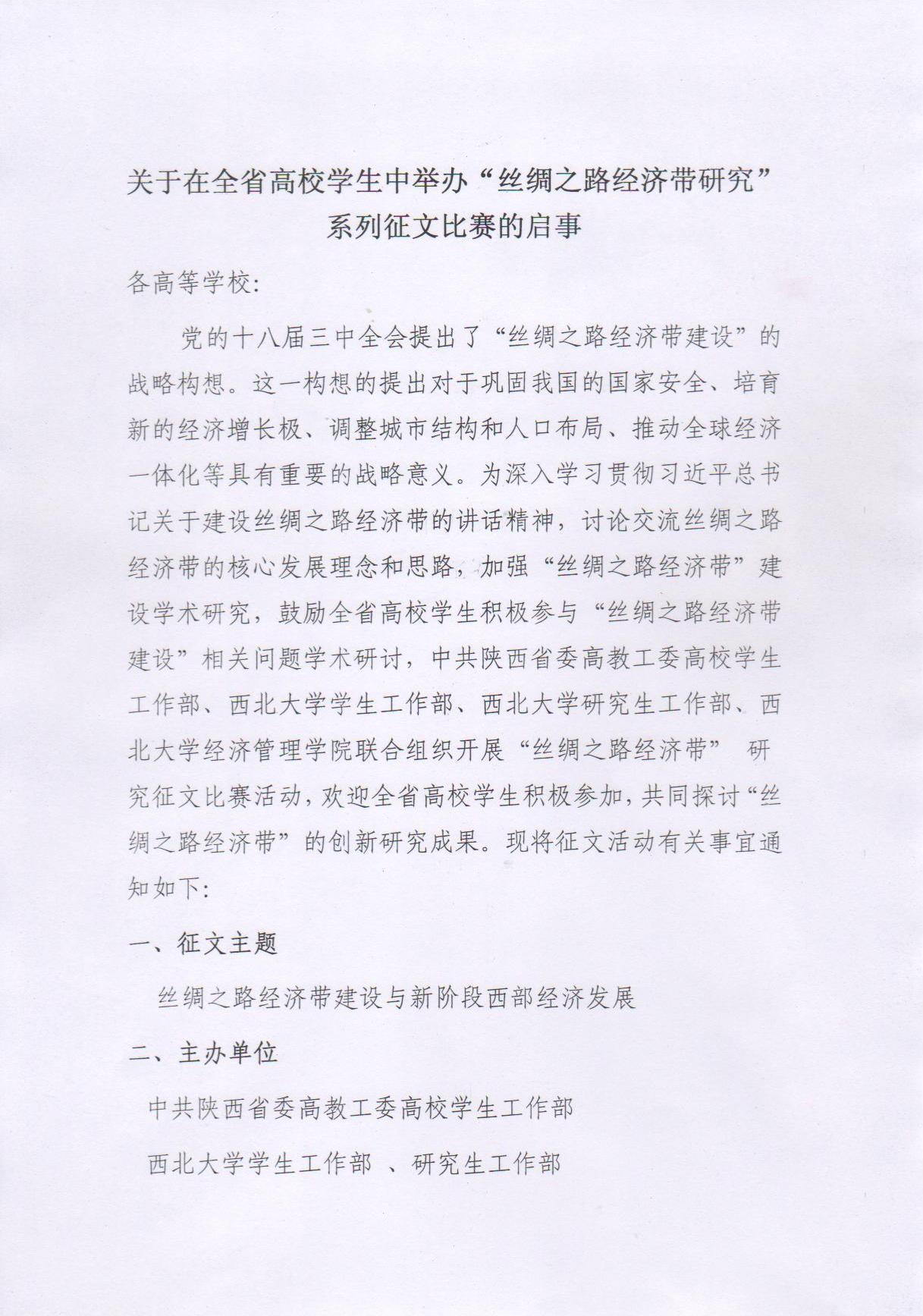 党的十八届三中全会提出了“丝绸之路经济带建设”的战略构想。这一构想的提出对于巩固我国的国家安全、培育新的经济增长极、调整城市结构和人口布局、推动全球经济一体化等具有重要的战略意义。为深入学习贯彻习近平总书记关于建设丝绸之路经济带的讲话精神,讨论交流丝绸之路经济带的核心发展理念和思路,加强“丝绸之路经济带”建设学术研究,鼓励全省高校学生积极参与“丝绸之路经济带建设”相关问题学术研讨,中共陕西省委高教工委高校学生工作部、太阳集团电子游戏学生工作部、太阳集团电子游戏研究生工作部、太阳集团电子游戏联合组织开展“丝绸之路经济带” 研究征文比赛活动,欢迎全省高校学生积极参加,共同探讨“丝绸之路经济带”的创新研究成果。现将征文活动有关事宜通知如下:
